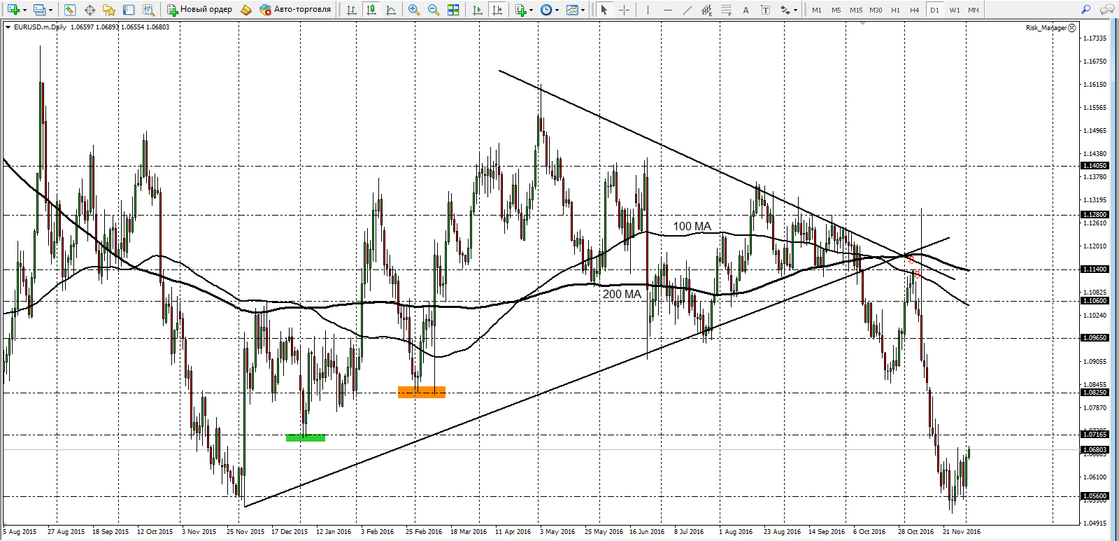 На графике D1 отмечены ключевые уровни пары EUR/USD.